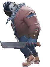 A menacing pink fluffy creature with a yellow beak and red eyes holds a large machete, ready for action.