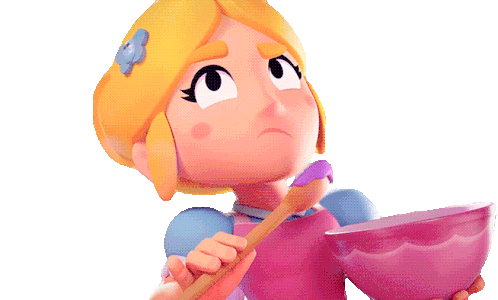 Piper from Brawl Stars holds a mixing bowl and spoon, looking thoughtful as if she just had an idea or realized something.