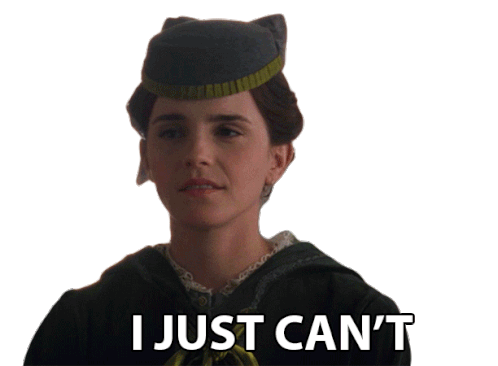 Emma Watson as Meg March expresses exasperation with a head shake and the caption 'I Just Can't'.