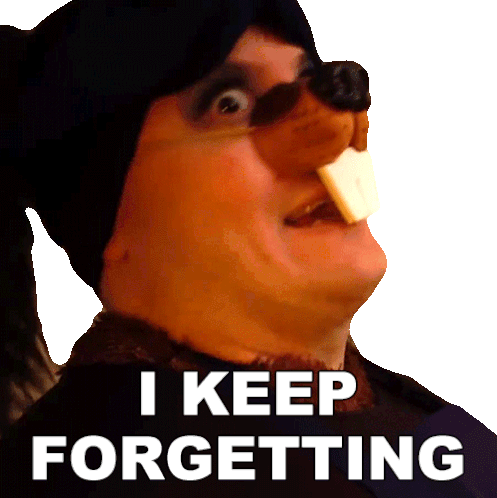 Gwen Pinkerton as Mama Bunny in a beaver costume, looking forgetful with the caption 'I KEEP FORGETTING'.