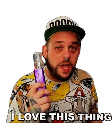 Doodybeard, wearing a Looney Tunes shirt, holds a purple device and enthusiastically expresses his love for it.