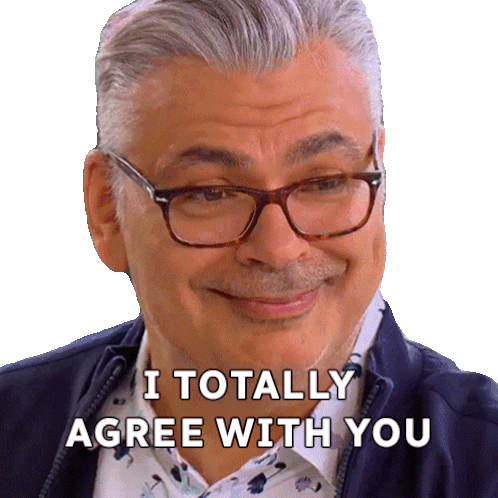 Bruno Feldeisen from The Great Canadian Baking Show nods and smiles, expressing full agreement with the caption 'I totally agree with you'.