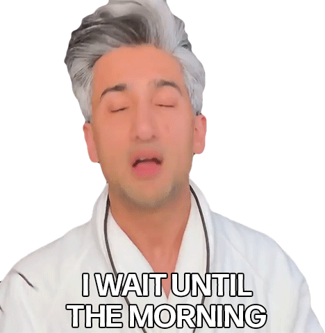 Tan France in a white robe says 'I wait until the morning' with a thoughtful and slightly exasperated expression.