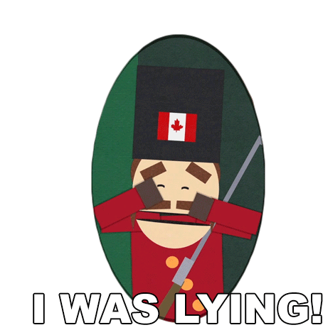 A South Park Canadian character in uniform shrugging with the caption 'I WAS LYING!' expressing dishonesty.