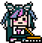 Ibuki Mioda from Danganronpa in pixel art style, depicted with blue and pink hair, holding a cleaning tool and moving playfully.