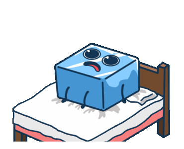 A tired ice cube character struggles to wake up, lying in bed with the caption 'CAN'T WAKE UP' above it.