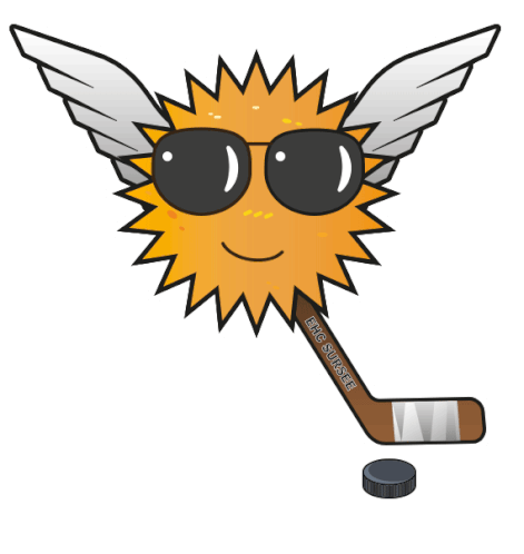 A cool, winged sun mascot wearing sunglasses, holding an EHC Sursee ice hockey stick and puck, ready for action.