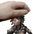 Identity V's Luca Balsa in pixel art, showing a hand placing a toy on a doll, a charming animated moment.