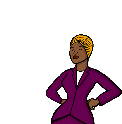 Ilhan Omar, a prominent figure, raises her fist in a powerful gesture of solidarity and determination, wearing a purple suit and yellow head covering.