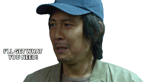 Seong Gi-hun from Squid Game, wearing a blue hat, emphatically states 'I'll Get What You Need!' with determination.