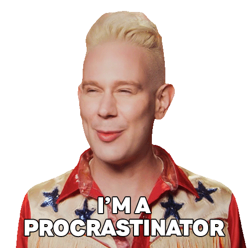 Jimbo from RuPaul's Drag Race All Stars declares 'I'm a procrastinator' in this relatable and humorous sticker.