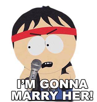 Stan Marsh from South Park, dressed as a rock star, passionately declares 'I'M GONNA MARRY HER!' with a microphone.