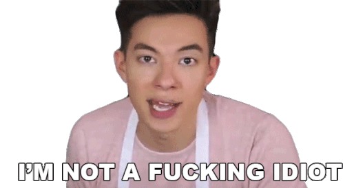 Motoki Maxted, wearing an apron, makes a funny face while saying "I'm Not A Fucking Idiot."