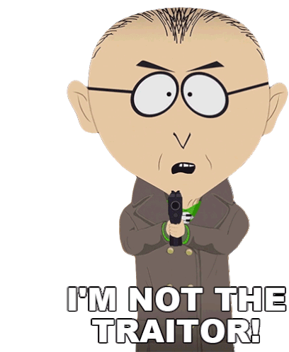 Mr. Mackey from South Park, holding a gun, declares 'I'm Not The Traitor!' with a worried and defensive expression.