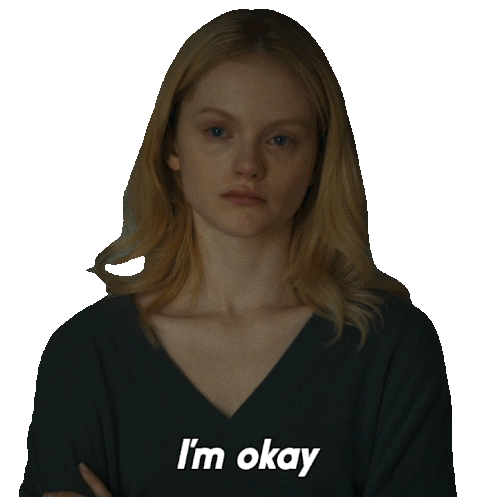Iris, a character from Mayor of Kingstown, states "I'm okay" with crossed arms, conveying self-assurance.