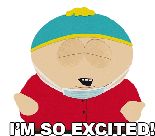 Eric Cartman from South Park exclaims 'I'M SO EXCITED!' with a face mask, showing extreme enthusiasm.
