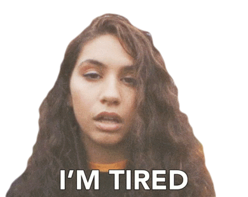 Alessia Cara, with her long hair, looks directly at the camera and mouths 'I'm Tired', conveying exhaustion.