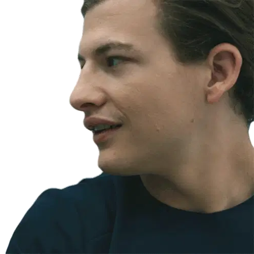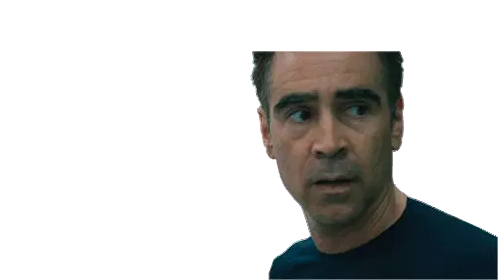 Colin Farrell, as seen in the Voyagers movie, looks intensely through a small porthole, feeling trapped. A Richard Alling sticker.