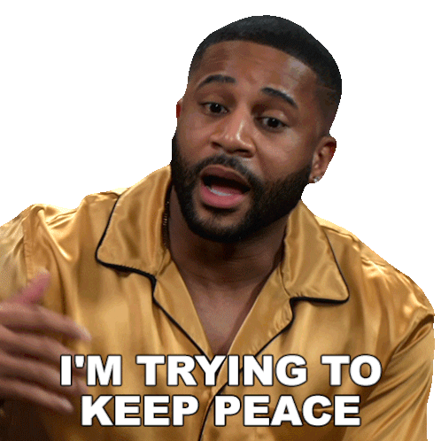 Zac from BET's Sistas, wearing a gold shirt, expresses his desire to maintain harmony by saying, 'I'm trying to keep peace.'