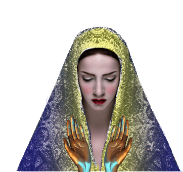 A serene depiction of Mary praying with hands raised, her veil shifting colors, embodying a prayer for everyone.