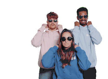 Lynn Filli Bas and Team Imu members in hoodies and sunglasses, posing with cool gestures.