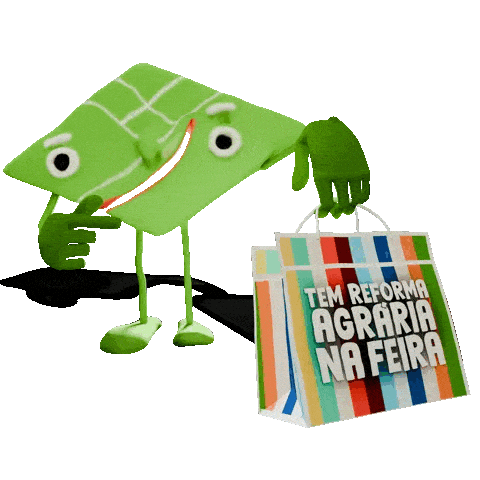 a green cartoon character is holding a shopping bag that says tem reforma agraria na feira