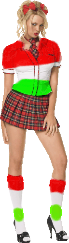 a woman in a school girl costume with green and red spots on her legs