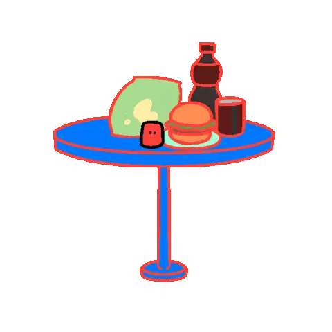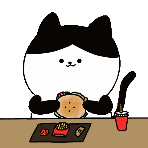 A vibrant cartoon sticker featuring a classic fast food hamburger with lettuce, cheese, patty, onions, and sauce.