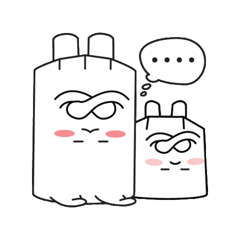 Two abstract, block-like characters with skeptical expressions and pink blush ponder, with one showing a thought bubble with ellipses.