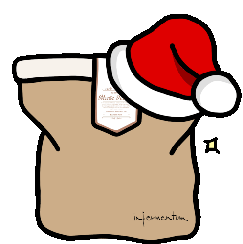 A festive Infermentum panettone bag wearing a Santa hat, perfect for Christmas greetings and holiday cheer.