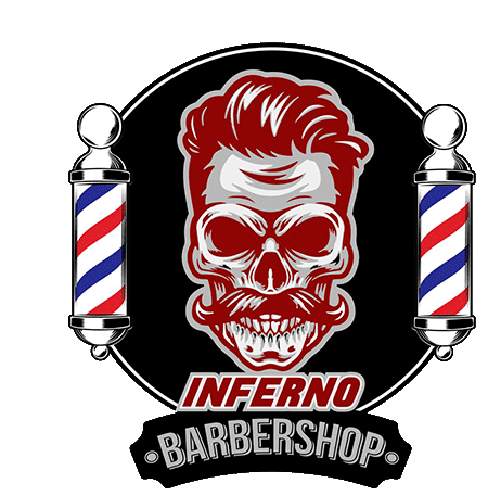 Stylized Inferno Barbershop logo featuring a red and white skull with a pompadour, flanked by classic barber poles.