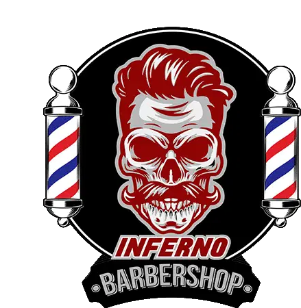A striking logo sticker featuring a red skull with a pompadour, flanked by classic barber poles, for Inferno Barbershop.