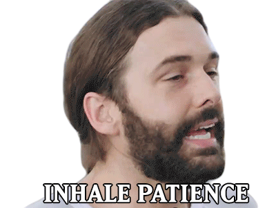 Jonathan Van Ness demonstrates a calming breathing exercise, inhaling patience and exhaling love with a serene expression.