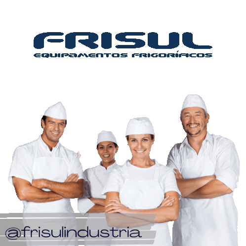 A smiling production team from Frisul Refrigeration Equipment, dressed in white uniforms and hats, ready for work.