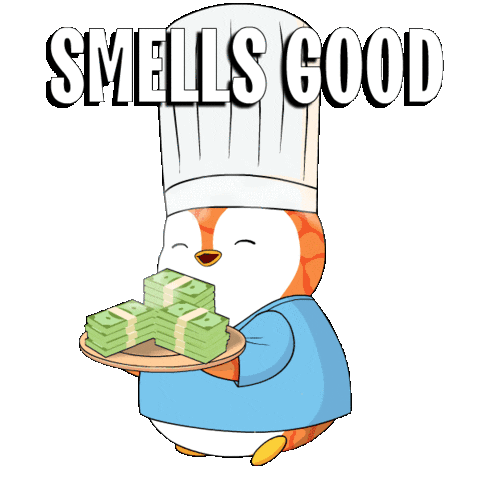 A happy Pudgy Penguin chef smells stacks of money, exclaiming "SMELLS GOOD," symbolizing success from social media.