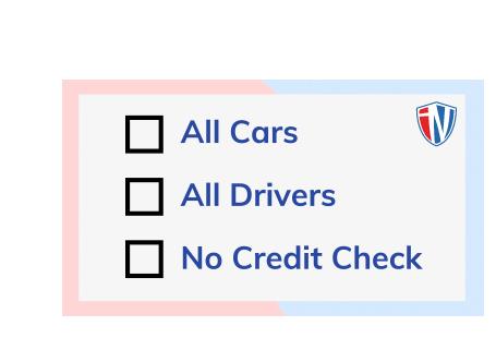 An animated checklist from Insurance Navy, highlighting 'All Cars', 'All Drivers', and 'No Credit Check' options.