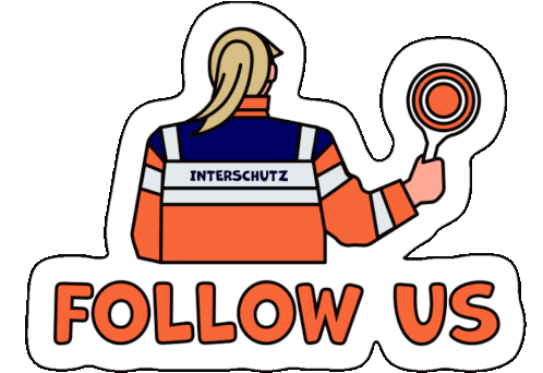Animated sticker showing a person in an Interschutz uniform holding a signal paddle, encouraging viewers to 'FOLLOW US'.