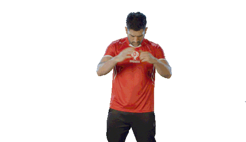 A male cricketer in a red Dream11 jersey performs arm circles, warming up for a match, likely related to the IPL.
