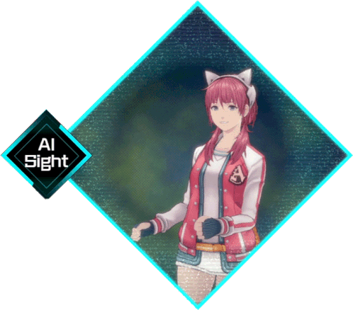 Iris from AI: The Somnium Files performs a dance, highlighted by the 'AI Sight' graphic, showcasing her energetic persona.