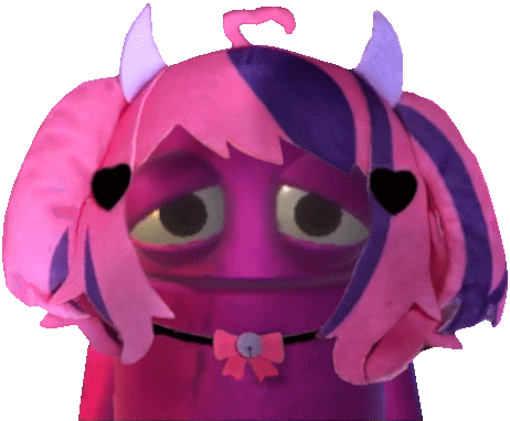 a pink and purple stuffed animal with horns and a bow