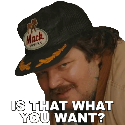 Matty Matheson, wearing a Mack Trucks hat, asks 'Is that what you want?' with a knowing smirk.
