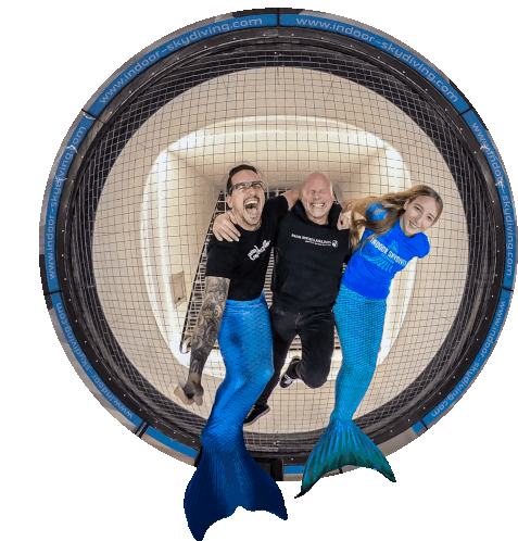 a group of people are posing in front of a circle that says indoor skydiving.com