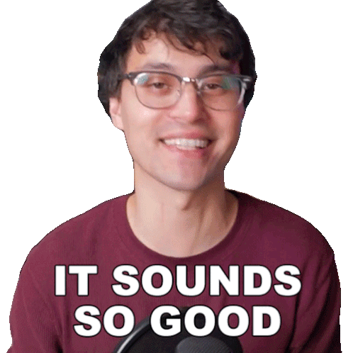 Hunter Engel smiles and nods, wearing a maroon shirt with 'IT SOUNDS SO GOOD' text, expressing approval.