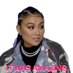 Agnez Mo enthusiastically declares 'It Was Amazing' with a positive and impressed reaction, wearing a stylish denim jacket.