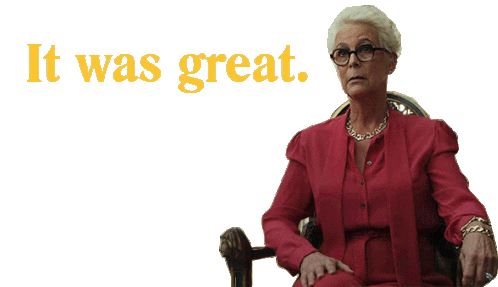 Jamie Lee Curtis as Linda Drysdale delivers a sarcastic 'It was great' with a deadpan expression, perfect for expressing feigned enthusiasm.
