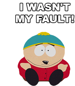 Eric Cartman from South Park denies responsibility, exclaiming 'I WASN'T MY FAULT!' with a worried expression.