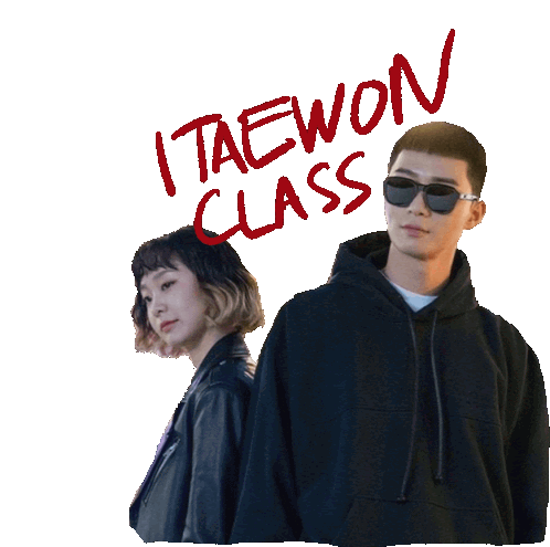 a man and a woman are standing next to each other and the words itaewon class are written above them