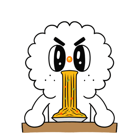 An angry cartoon character intensely slurps a large bowl of pasta, with colorful ingredients visible.