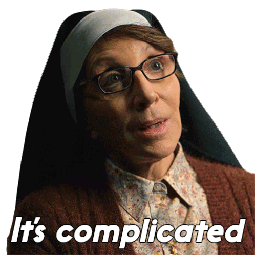 Sister Andrea, the nun from Evil, says 'It's complicated' with a thoughtful expression, wearing glasses.