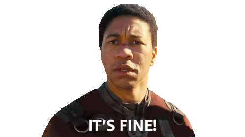 Maximus from the Fallout TV series says "It's fine!" with a slightly worried yet reassuring expression.